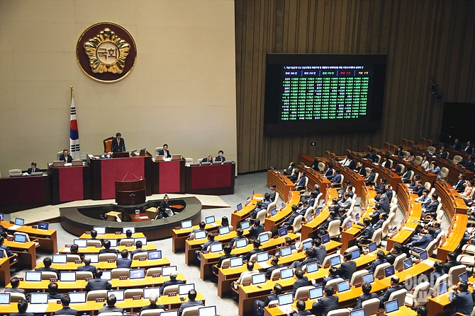 6일, 서울 여의도 국회 본회의장서 열린 본회의 도중 가습기살균제 국정조사 계획서 승인의 건 표결 결과 만장일치로 본회의를 통과하고 있다.