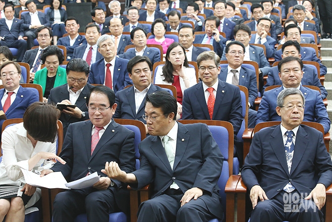 6일, 서울 여의도 국회서 열린 새누리당 의원총회 도중 정진석 원내대표가 박명재 사무총장이 든 자료를 들여다보고 있다.