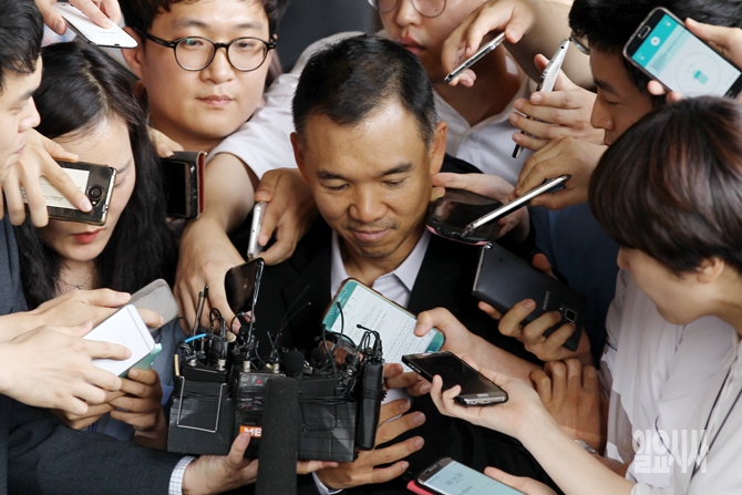 넥슨 창업주 김정주 NXC(넥슨지주회사) 회장이 13일 오후 서울 서초구 서울중앙지방검찰청에서 진경준 검사장 주식 뇌물 의혹과 관련해 피의자 신분으로 검찰 소환조사에 출석하기 전 취재진의 질문을 들으며 생각에 잠겨 있다.
