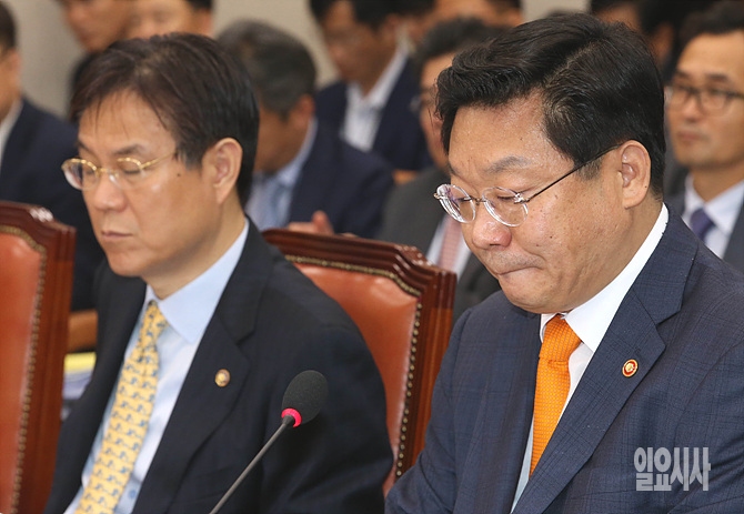 13일, 서울 여의도 국회서 열린 산업통상자원부 전체회의 도중 주형환 산자부장관이 한 의원의 질의에 잠시 곤혹스러운 표정을 짓고 있다.