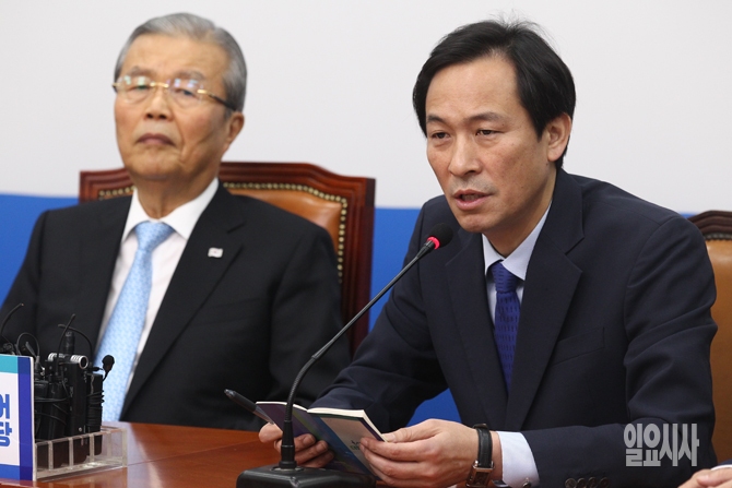 25일 오전 서울 여의도 국회에서 열린 더불어민주당 비상대책위원회의에서 우상호 더불어민주당 원내대표가 발언을 하고 있다.
