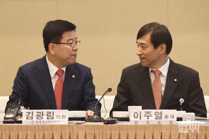 김광림 새누리당 정책위의장과 이주열 한국은행 총재가 27일 오전 서울 여의도 국회에서 열린 경제재정연구포럼 조찬강연에서 대화를 하고 있다.