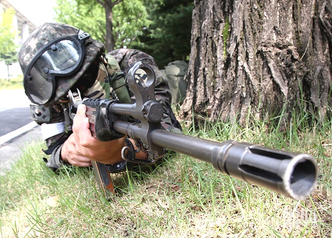 24일, 서울 여의도 국회서 열린 '2016 재난 및 대테러 대응 훈련' 리허설 도중 한 대원이 물샐틈없는 경계를 유지하고 있다.
