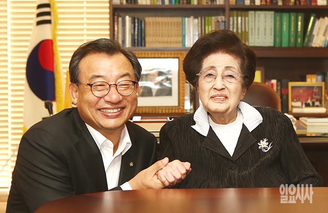 6일, 서울 마포구 김대중도서관을 찾은 이정현 새누리당 대표가 이희호 여사와 기념촬영을 갖고 있다. (사진=사진공동취재단)