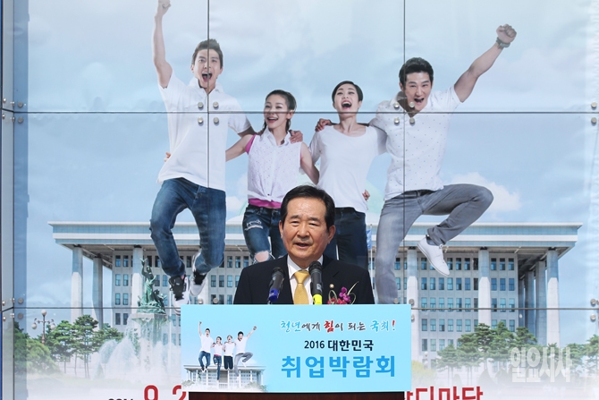정세균 국회의장이 23일 오전 서울 여의도 국회에서 열린 '2016 대한민국 취업박람회'에서 축사를 하고 있다.