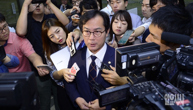 27일 오후 새누리당의 '국감 보이콧' 당론에 맞서 국감 출석의사를 밝힌 김영우(새누리당) 국회 국방위원장이 같은 당 의원들로부터 사실상 국방위원장실서 감금 당했다가 상황이 마무리된 뒤 취재진에게 입장을 밝히고 있다.