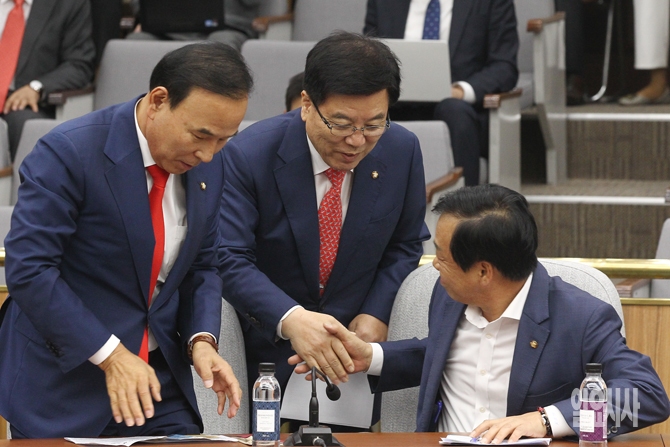 김광림 정책위의장이 14일 오전 서울 여의도 국회에서 열린 새누리당 국정감사대책회의에서 이완영 의원과 악수를 하고 있다.