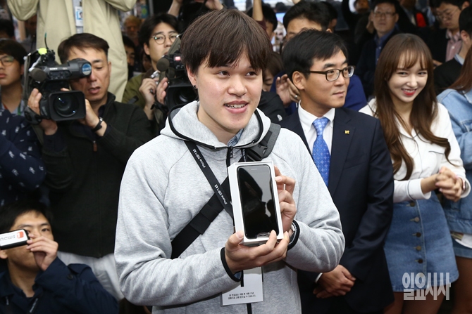 애플 아이폰7과 아이폰7 플러스의 한국 출시가 시작된 21일 오전 서울 광화문 KT 매장에서 KT 아이폰7 국내 1호 개통자인 유병문씨가 아이폰7을 들고 기념촬영을 하고 있다.