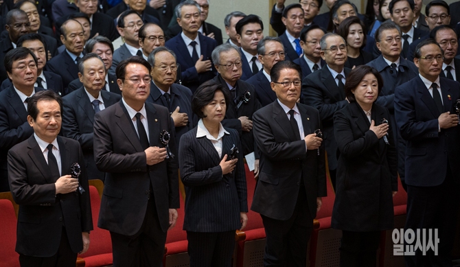 22일 오전 서울 동작구 국립현충원에서 열린 '김영삼 전 대통령 서거 1주기 추모식'에 참석한 정세균 국회의장(왼쪽부터), 정진석 새누리당 원내대표, 추미애 더불어민주당 대표, 박지원 국민의당 비대위원장, 심상정 정의당 대표 및 정관계 인사, 추모객들이 국민의례를 하고 있다.