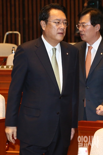 정진석 새누리당 원내대표가 1일 오전 서울 여의도 국회에서 열린 새누리당 의원총회에 입장하고 있다.