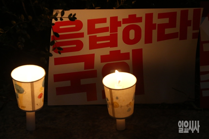 박근혜 대통령 탄핵소추안 표결이 하루 앞으로 다가온 8일 오후 서울 영등표구 여의도 국회의사당 인근에 박근혜 대통령 탄핵안의 국회 본회의 가결을 촉구하는 피켓과 촛불이 놓여 있다.