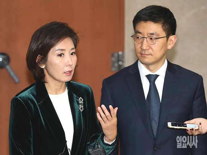 원내대표 후보로 나선 나경원 새누리당 의원(사진 왼쪽)과 정책위의장 후보로 나선 김세연 의원이 14일, 서울 여의도 국회 정론관 출마 기자회견 직후 취재진의 질문에 답변하고 있다.