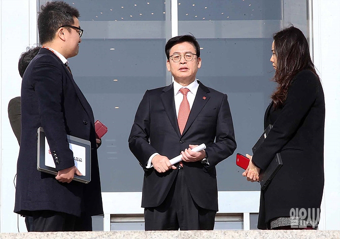 정우택 새누리당 신임 원내대표가 21일, 서울 여의도 국회 본청 앞에서 같은 날 비박(비 박근혜)계 인사들의 집단 달탕과 관련한 취재진의 질의에 답변하고 있다.