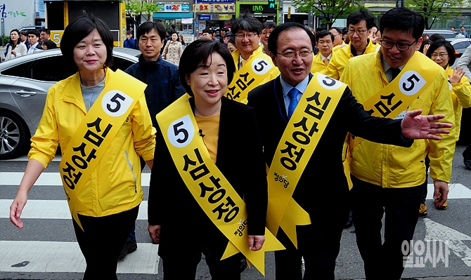 정의당 심상정 대선후보(사진 가운데)가 17일, 노회찬 상임선거위원장, 이정미 의원 등과 함께 서울시 영등포구 여의도 일대서 19대 대선 첫 유세를 갖고 있다.