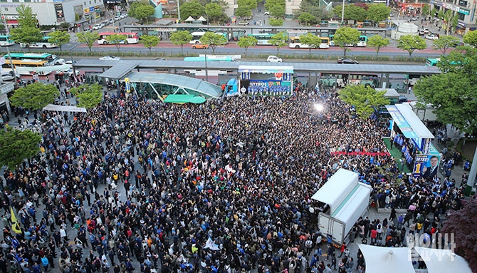 더불어민주당 문재인 대선후보가 27일 오후 경기도 성남시 야탑역 광장에서 열린 집중유세에서 지지를 호소하고 있다.