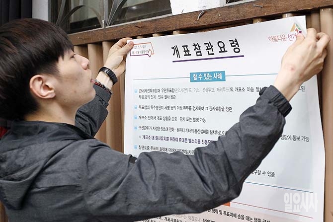 제19대 대통령선거를 하루 앞둔 8일 오후 서울 영등포구 여의도고등학교에 마련된 개표소에서 선관위 관계자가 참관인 주의사항 벽보를 붙이고 있다.