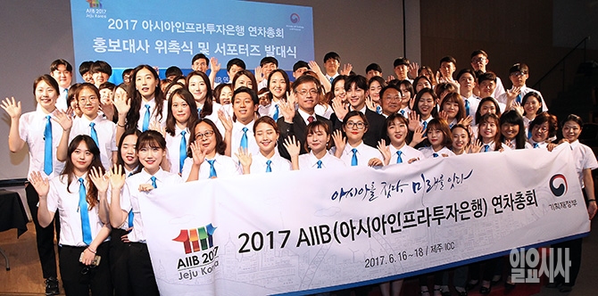 유일호 총리 권한대행 겸 경제부총리와 배우 지창욱이 16일 오전 서울 종로 세종로 올레스퀘어에서 열린 '2017 아시아인프라투자은행(AIIB) 연차총회' 서포터즈 발대식 및 홍보대사 위촉식에 참석해 서포터즈와 함께 기념촬영을 하고 있다.