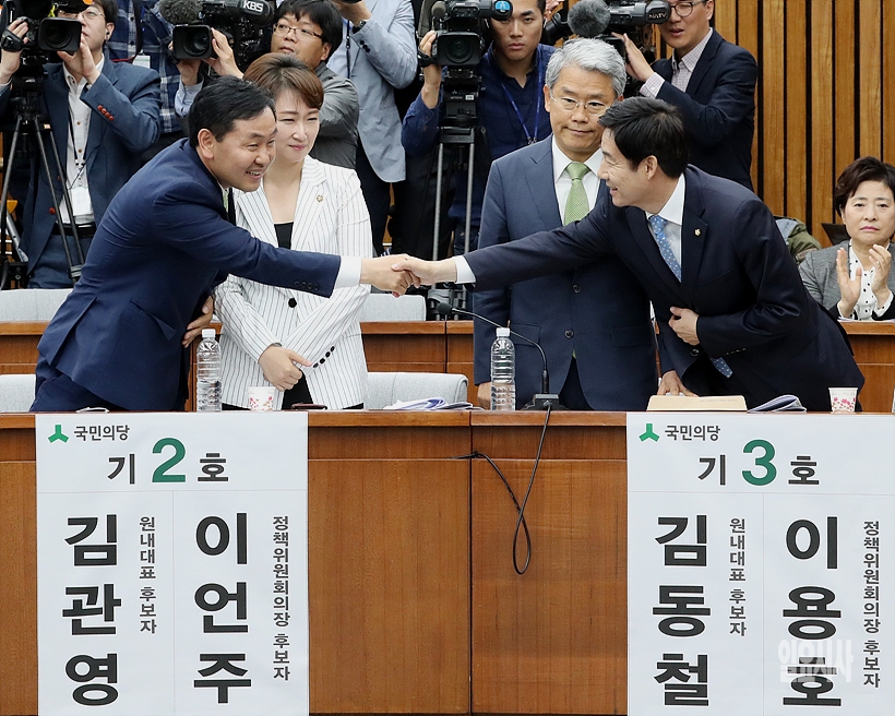 이용호 국민의당 정책위의장 후보자가 16일, 서울 여의도 국회서 '원내대표 및 정책위원회의장 선출 의원총회'에 앞서 김관영 원내대표 후보자와 악수를 나누고 있다.