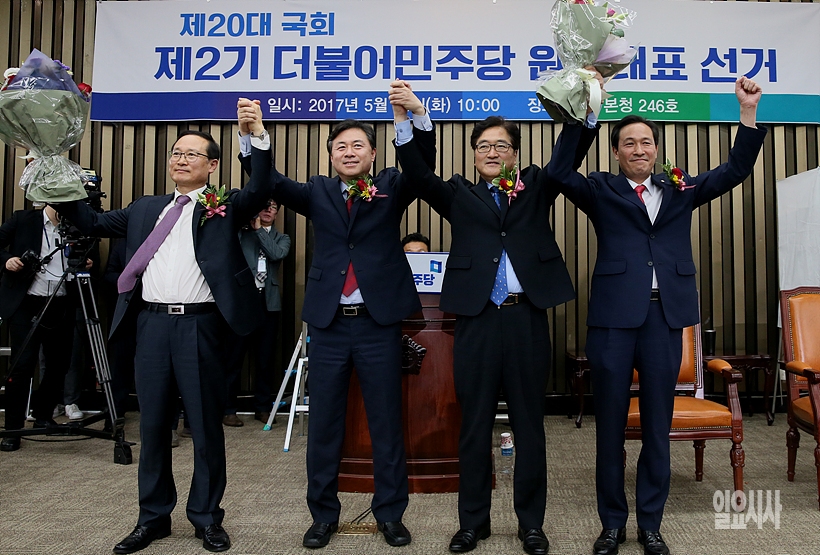 우원식 더불어민주당 신임 원내대표(사진 왼쪽서 세 번째)와 우상호 전 원내대표(오른쪽) 등이 16일, 서울 여의도 국회서 열린 '제2기 민주당 원내대표 선거' 직후 꽃다발을 들어보이고 있다.