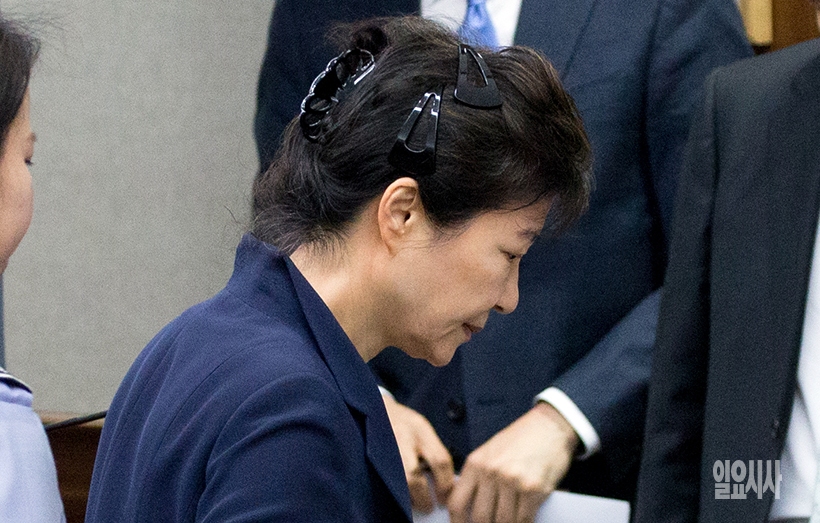 박근혜 전 대통령이 23일 오전 서울 서초동 서울중앙지법 417호 대법정에서 열린 뇌물혐의 등에 대한 첫 번째 공판에 출석해 피고인석으로 가고 있다.