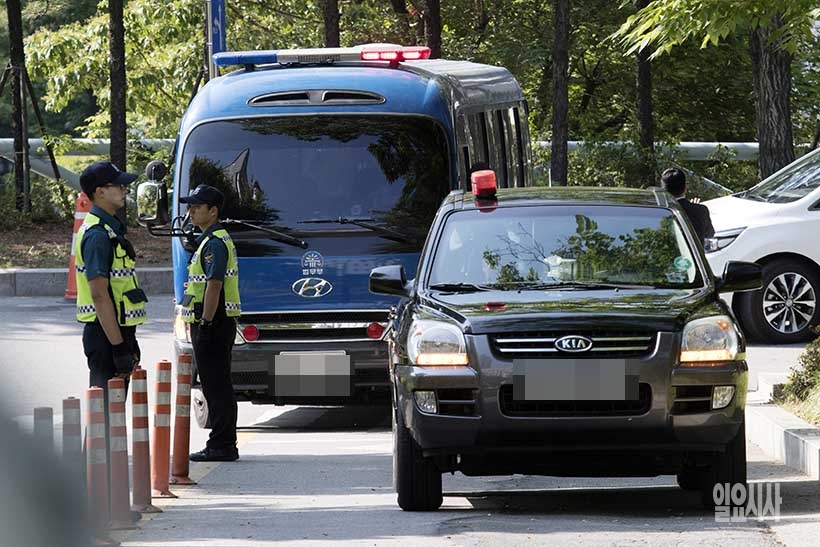 뇌물혐의 등으로 구속기소 된 박근혜 전 대통령이 탄 호송차가 25일 오전 서울 서초동 서울중앙지법에서 열리는 2차 공판에 출석하기 위해 수감장으로 들어오고 있다.