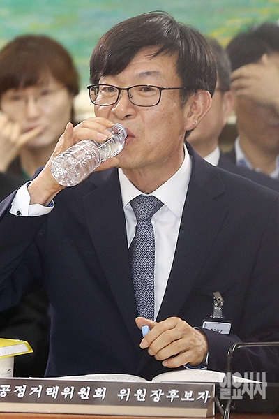 김상조 공정거래위원장 후보자가 2일 오전 서울 여의도 국회 정무위 회의실에서 열린 인사청문회에 참석해 물을 마시고 있다.