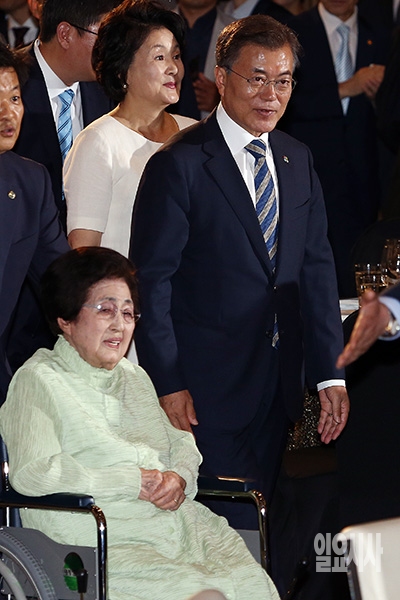 이희호 여사와 문재인 대통령이 15일 오후 서울 여의도 63빌딩에서 열린 '6·15 남북공동선언 17주년 기념식'에 참석하고 있다.
