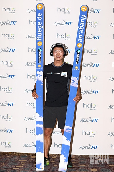 스키점프 최흥철 선수가 19일 오전 서울 중구 롯데호텔에서 열린 웨어러블 트레이닝 장치인 '헤일로 스포츠(Halo Sport)' 공개 행사에서 포토타임을 갖고 있다.