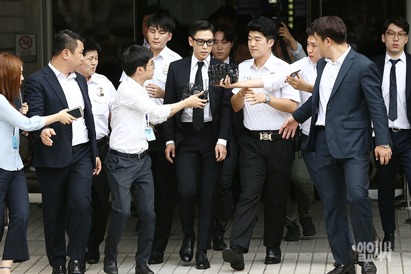 그룹 빅뱅의 멤버 탑(본명 최승현)이 20일 오후 서울 서초구 서울중앙지방법원에서 열린 대마초 흡연(마약류 관리법 위반) 혐의 관련 선고 공판을 마치고 법원을 빠져나오고 있다.