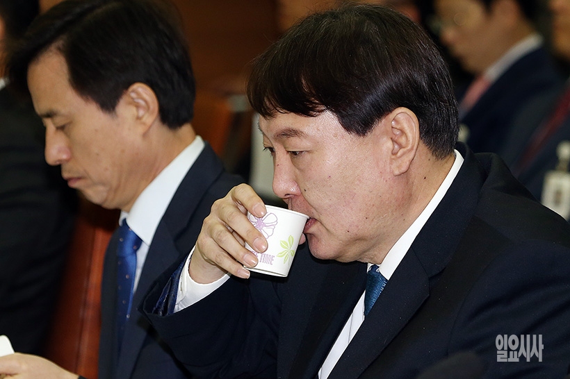 윤석열 서울중앙지검장이 23일 오전 서울 서초구 서울고등검찰에서 열린 국회 법제사법위원회의 서울고등검찰청·서울중앙지방검찰청 등에 대한 국정감사에서 물을 마시고 있다.