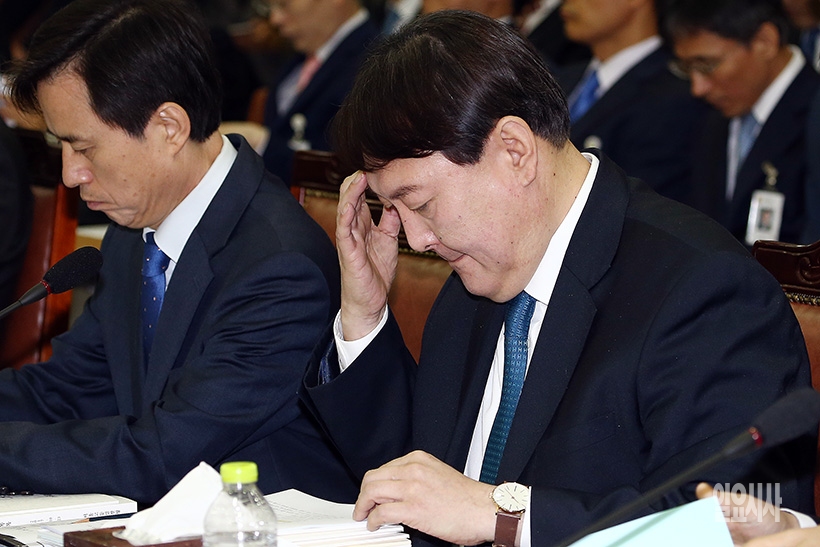 윤석열 서울중앙지검장이 23일 오전 서울 서초구 서울고등검찰에서 열린 국회 법제사법위원회의 서울고등검찰청·서울중앙지방검찰청 등에 대한 국정감사에서 의원들 질의에 대해 생각을 하고 있다.
