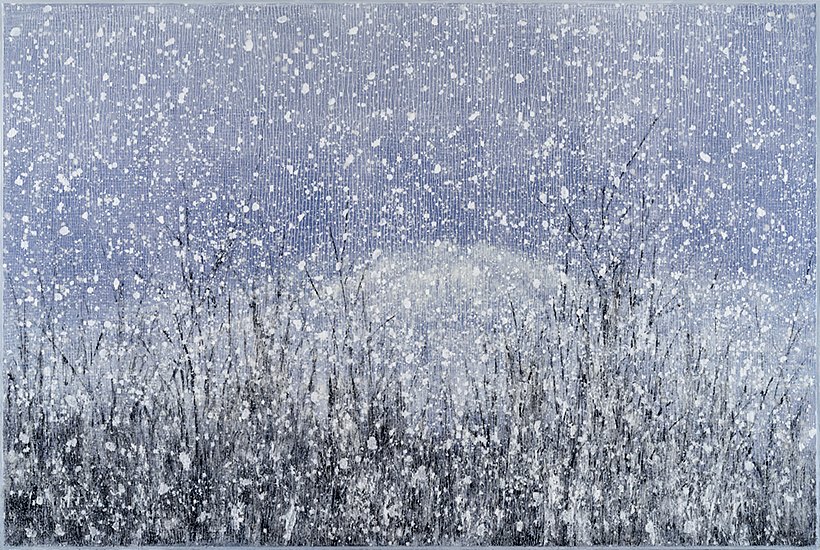 물을 담은 에어건과 마른 붓을 차례로 쓰며 지워내는 과정서 형상이 드러난다. 억지로 쌓아 만들기보다는 저절로 저 깊은 곳에서 우러나오는 풍광이다. 그리고 캔버스 위에 젤을 이용해 망 처리를 한다.