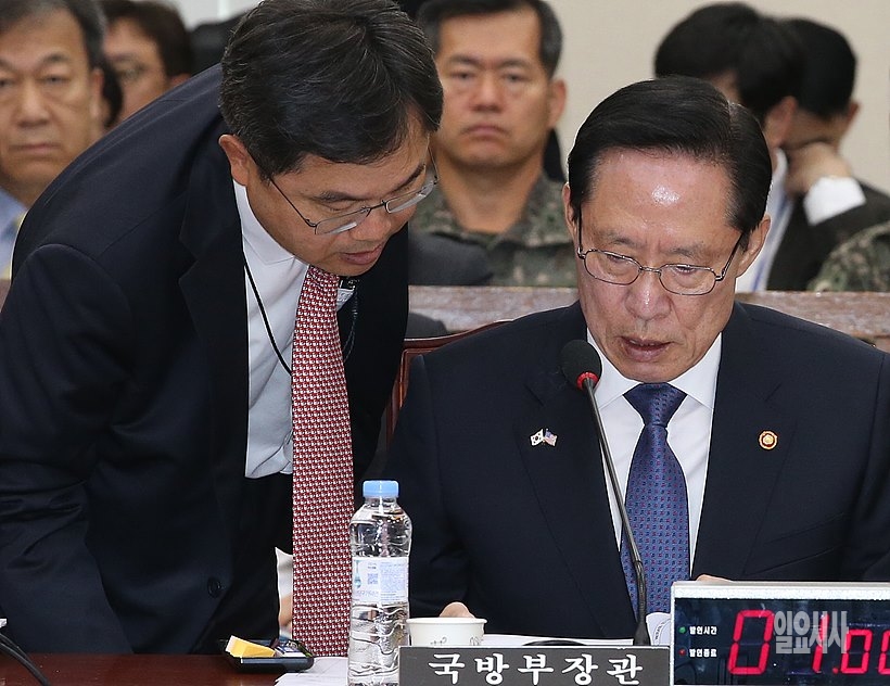 송영무 국방부장관이 7일, 서울 여의도 국방위원회 회의실서 열린 2018년도 예산안 및 기금운용계획안 관련 전체회의에 출석해 관계자로부터 보고를 받고 있다.
