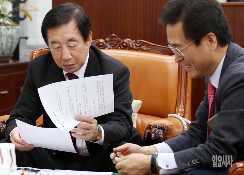 김성태 자유한국당 신임 원내대표(사진 왼쪽)가 13일, 서울 여의도 국회를 찾아 자신을 예방한 한병도 청와대 정무수석과 환담 도중 발언 관련 서류를 확인하고 있다.