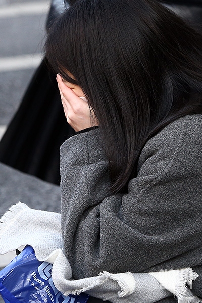 21일 오전 서울 송파구 서울아산병원 장례식장서 엄수된 그룹 샤이니의 멤버 고 종현의 발인식 도중 한 팬이 흐느끼고 있다.