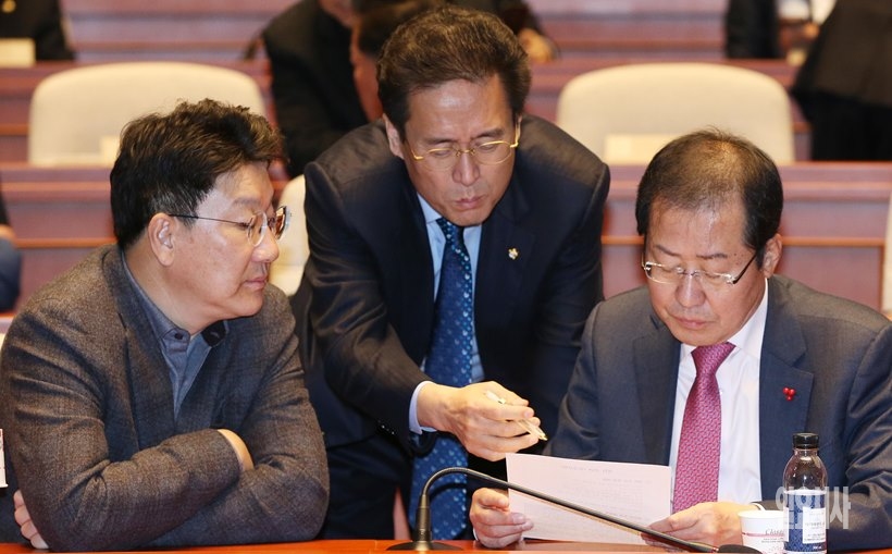 홍준표 자유한국당 대표(사진 오른쪽)와 함진규 정책위의장(가운데)이 29일, 서울 여의도 국회서 열린 의원총회에 앞서 발언문을 확인하고 있다.