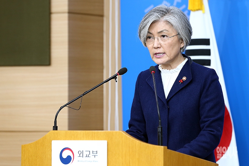 강경화 외교부장관이 9일 오후 서울 종로구 외교부 청사에서 한일 위안부 합의 후속 조치 방향에 대한 정부 입장을 발표하고 있다.