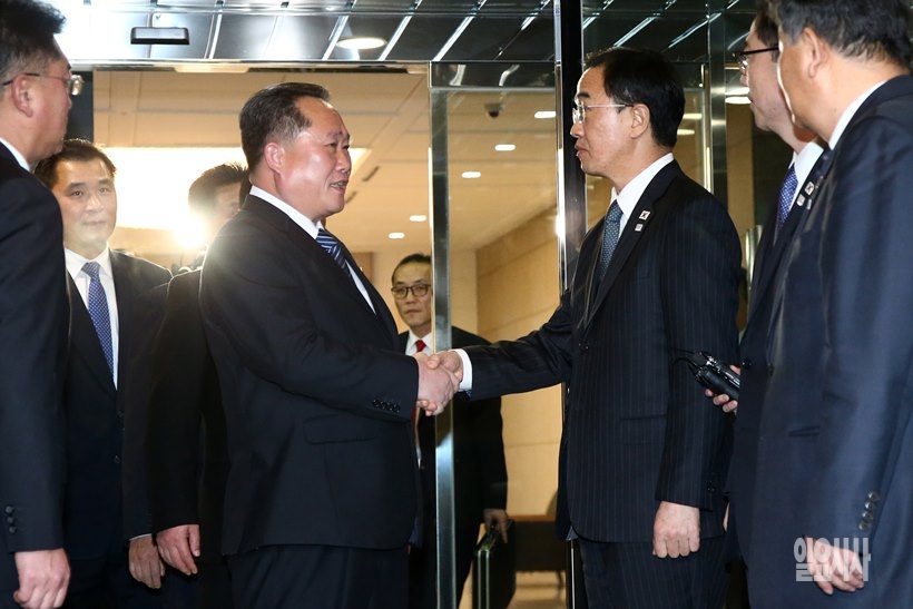남북 고위급회담 남측 대표단의 조명균 통일부장관(사진 오른쪽)과 북측 대표단의 리선권 조국평화통일위원장이 9일, 판문점 평화의집서 열린 종결회의 직후 악수를 나누고 있다. <사진공동취재단>