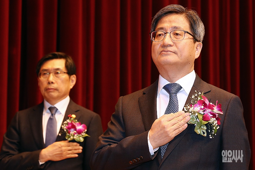 박상기 법무부장관과 김명수 대법원장이 15일 오후 경기도 고양시 사법연수원에서 열린 '제47기 사법연수생 수료식'에서 국민의레를 하고 있다.