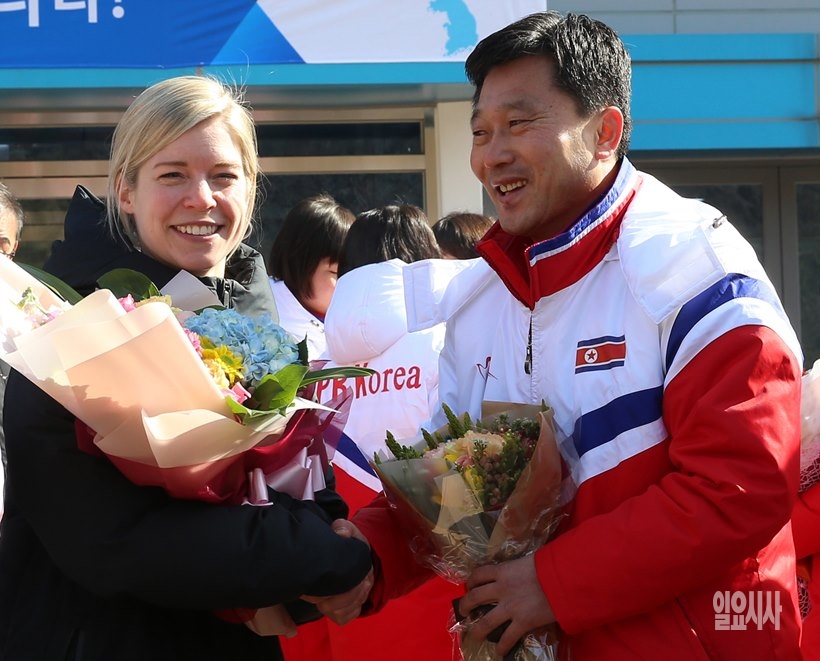 세라 머리(사진 왼쪽) 여자 아이스하키 단일팀 총감독과 박철호 북측 아이스하키 감독이 25일, 충북 진천군 진천 국가대표선수촌 앞에서 미소를 머금은 채 악수를 나누고 있다. <사진공동취재단>