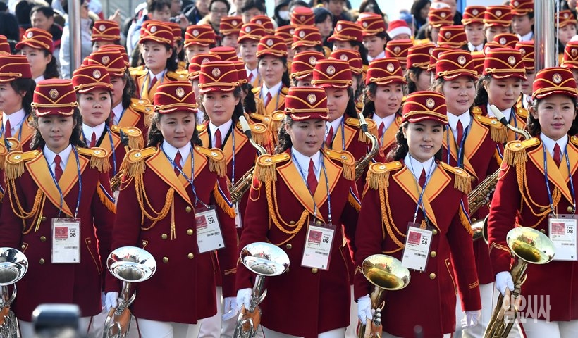 8일, 2018 평창동계올림픽 북한 응원단이 강원도 강릉선수촌서 열린 입촌식에 앞서 공연을 위해 입장하고 있다. <2018평창사진공동취재단>