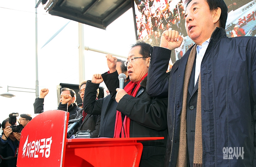 홍준표 자유한국당 대표가 26일 오후 서울 종로구 청계광장서 열린 '김영철 북한 노동당 중앙위원회 부위원장 방남 규탄대회'서 구호를 외치고 있다.
