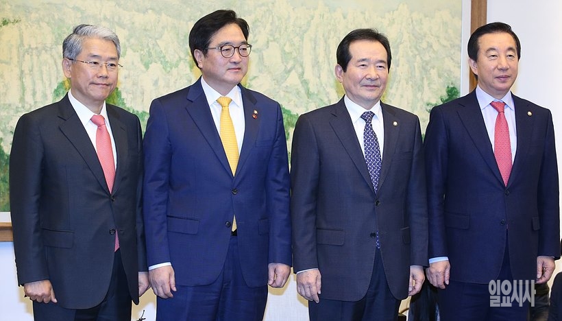 정세균 국회의장 및 우원식(사진 왼쪽서 두 번째, 더불어민주당)·김동철(왼쪽, 바른미래당)·김성태(자유한국당) 원내대표들이 19일, 서울 여의도 국회 의장실서 문재인 대통령의 개헌안 발의와 관련한 회동에 앞서 기념촬영을 갖고 있다.