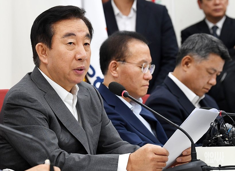 김성태 자유한국당 원내대표 겸 대표권한대행이 18일, 서울 여의도 국회 본청 원내대표실서 열린 기자회견서 발언을 하고 있다.