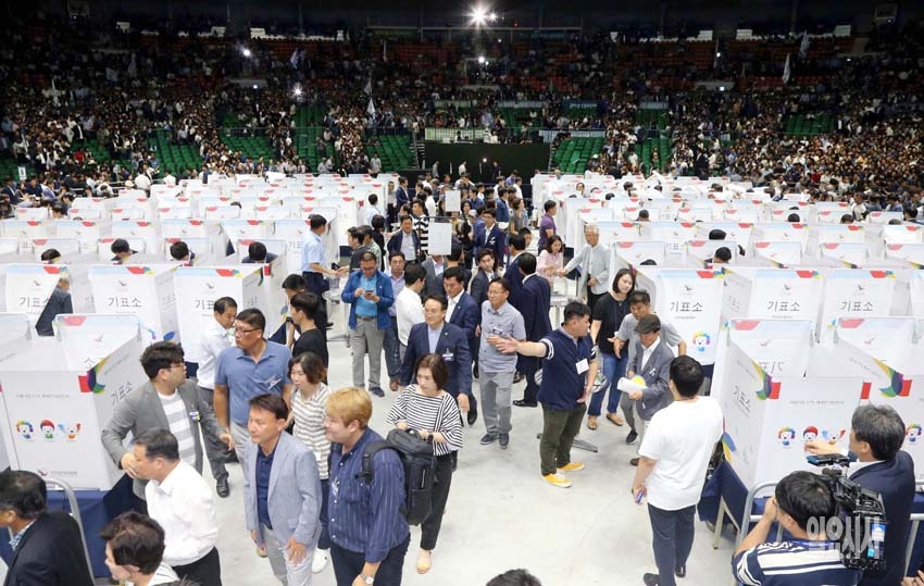 25일 오후 서울 송파구 방이동 올림픽공원 체조경기장서 진행된 더불어민주당 제3차 정기전국대의원대회서 대의원들이 당 대표와 최고위원 투표를 하고 있다.