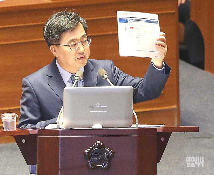 김동연 경제부총리 겸 기재부장관이 2일, 서울 여의도 국회 본회의장서 속개된 경제분야 대정부질문에 출석해 자료를 들어 보이며 의원들의 질의에 답변하고 있다.