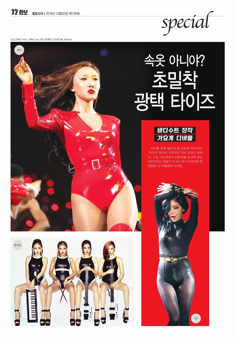 모두를 깜짝 놀라게 한 초밀착 바디수트. 마마무 화사의 파격적인 무대 의상이 화제다. 사실 가요계서 비욘세를 연상케 하는 바디수트는 처음이 아니다. 섹시 디바라면 한 번씩은 다 착용해본 아이템. ⓒCJ E&M, 아레나, bnt, DHC KOREA, 인스타그램, Glamour