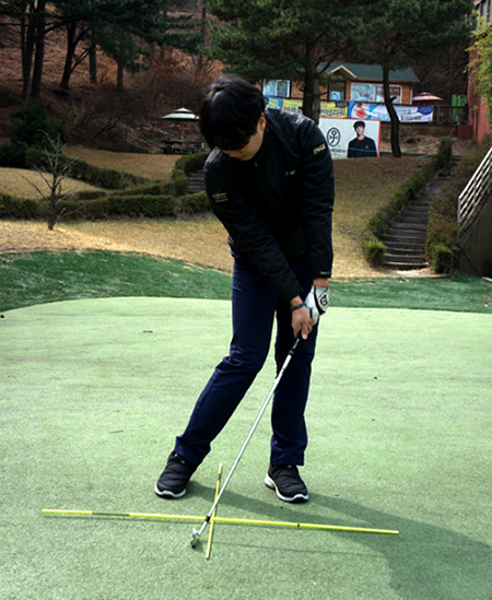 ▲스탠스= 평소보다 스탠스를 조금 좁게 선다. 스탠스를 너무 넓게 서면 몸이 일어나거나 체중 이동이 원활하게 되지 않아 몸의 중심이 오른발에 남게 되는데, 이렇게 되면 낮은 탄도의 공을 치기 어렵게 된다. 스탠스를 조금 좁힌 상태에서 체중은 평소보다 왼발에 조금 더 싣고 공은 일반 샷의 위치보다 1개 정도 오른쪽에 놓는다.