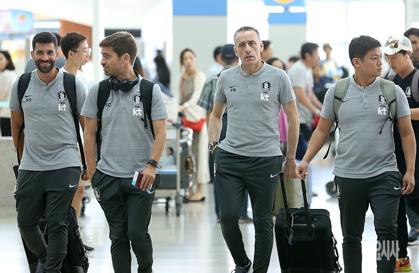 한국 남자 축구 국가대표팀 파울루 벤투 감독(왼쪽서 세 번째)이 <2022 카타르 월드컵> 아시아 2차 예선을 위해 2일 인천국제공항서 터키로 출국 하고 있다. 일요시사=문병희 기자(moonphoto@ilyosisa.co.kr)