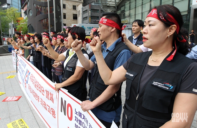 [일요시사 사진부] 문병희 기자 = 2일 서울 중구 서울중앙우체국 앞에서 민주노총 공공운수노조 우체국시설관리단지부 조합원들이 ‘우정사업본부 직접고용 쟁취과 노조탄압 분쇄, 우체국시설관리단 해체’를 요구하는 기자회견에서 구호를 외치고 있다. (moonphoto@ilyosisa.co.kr)